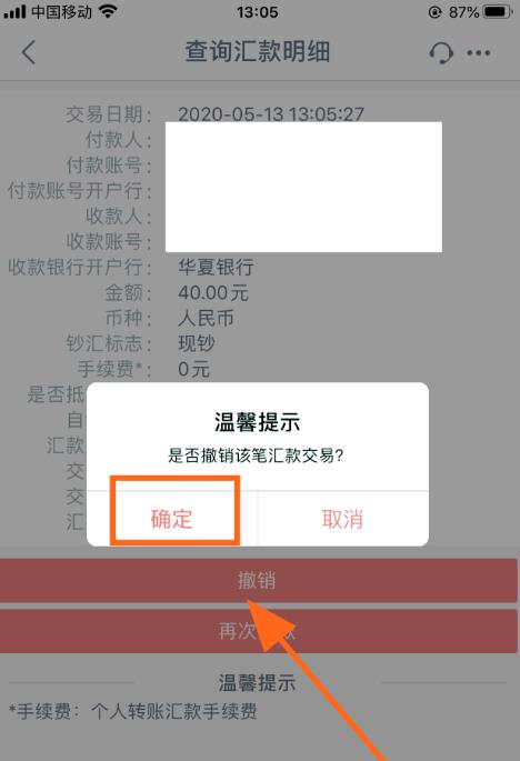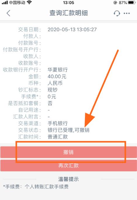 5、点击此笔交易记录,进入【交易详细页】,点击【撤销】按键;