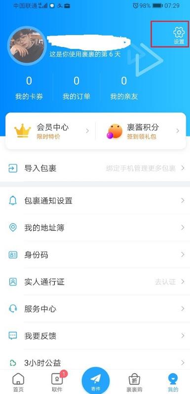 1、打开菜鸟裹裹,进去我的界面,点击设置,如下图所示: