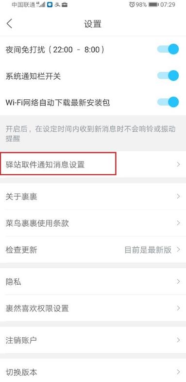 2、在设置界面,点击驿站取件通知消息设置,如下图所示:
