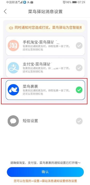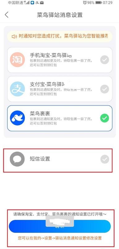 以上就是菜鸟裹裹app默认的菜鸟裹裹通知改为发短信通知的教程,希望大家喜欢,请继续关注脚本之家。