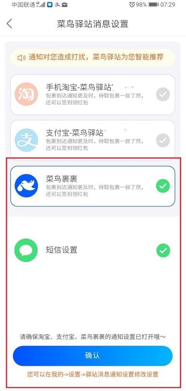 5、可以看到已经成功设置菜鸟驿站短信通知了,如下图所示: