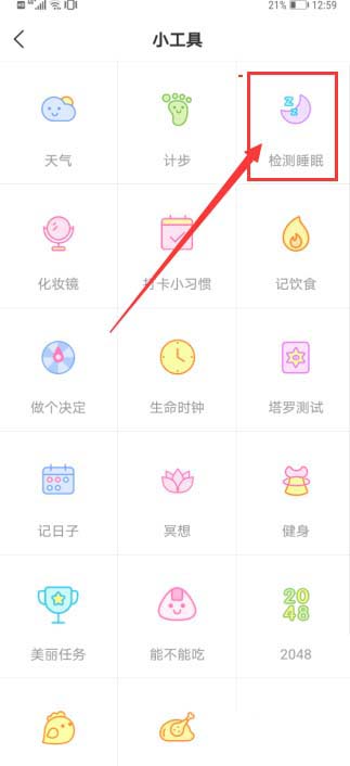 3、在小工具列表主页面,点击第一排最右侧的【检测睡眠】栏目,进入到检测睡眠主页面。