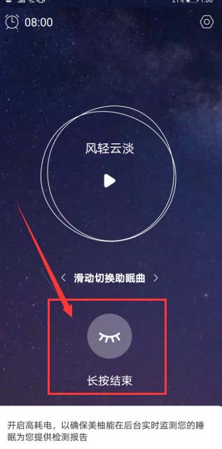 5、睡醒之后返回到美柚APP睡眠监测页面,长按小眼睛形状的按钮,就可以结束睡眠监测功能。