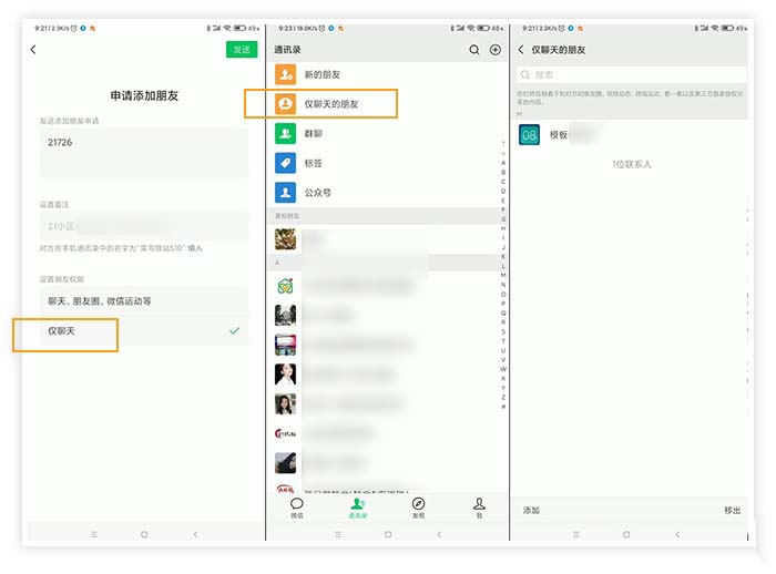 如果你在添加好友时,将对方权限设置为“仅聊天”,那么就会在“通讯录-仅聊天的朋友”看到他。