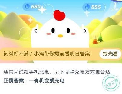 支付宝蚂蚁庄园中用户通过完成支付等任务可以获得喂养小鸡的饲料,答题是比较好完成的,今天答题是通常来说给手机充电以下哪种充电方式更合适,小编为大家带来蚂蚁庄园答题攻略。