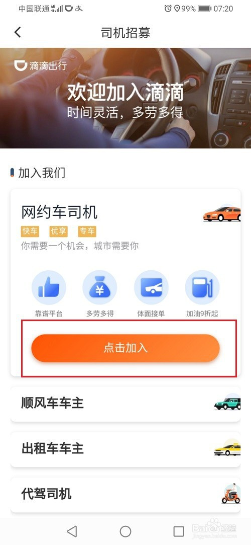 第三步在车主招募界面,点击加入滴滴网约车,如下图所示: