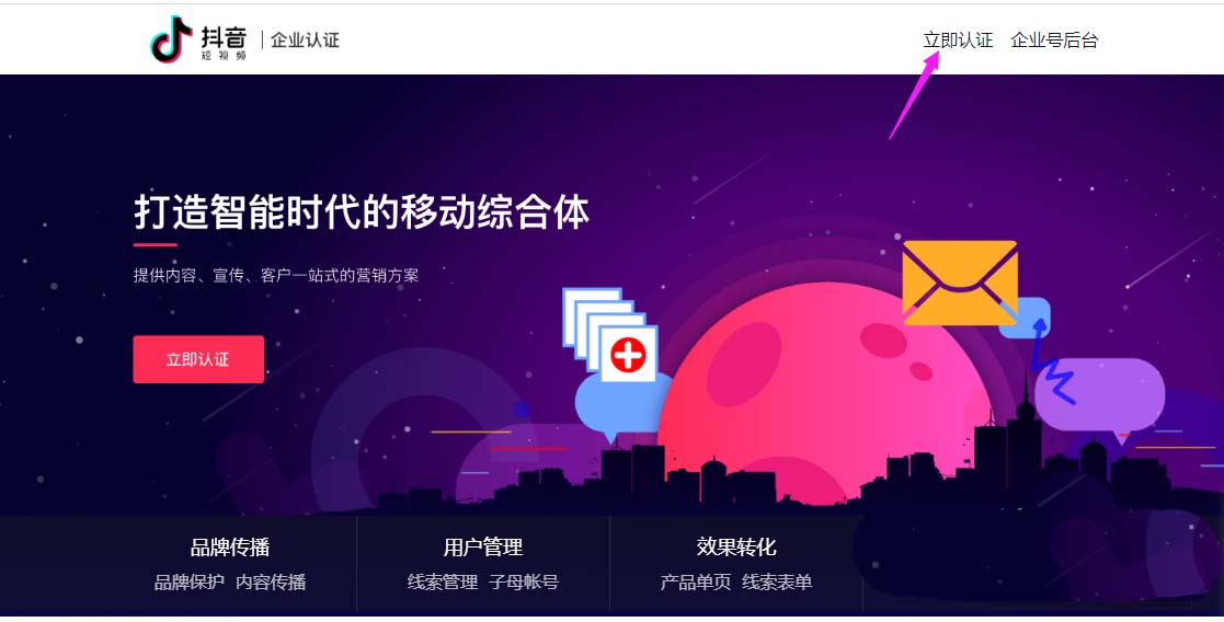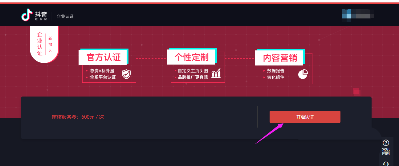 进入抖音企业认证网站后,点击右上方的“立即认证”