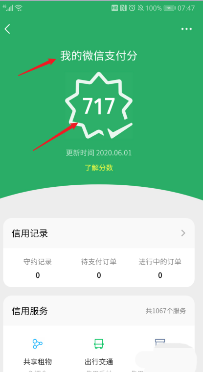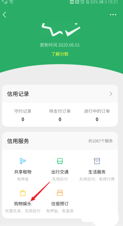 查看到目前【支付分】是717,往下拉,拉到【购物娱乐】,点击它。
