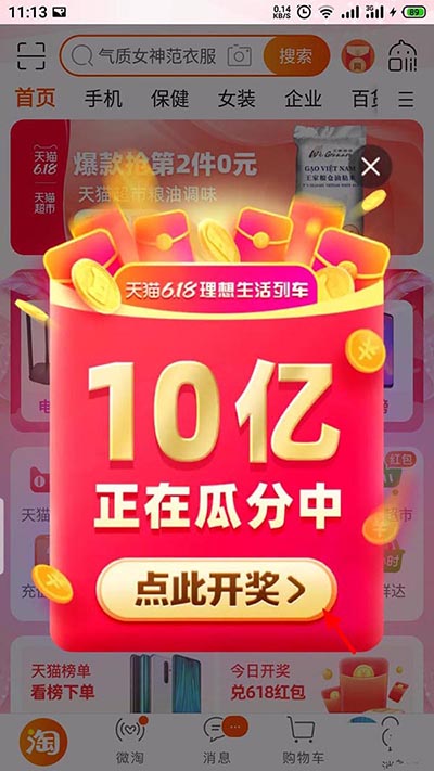 2、打开淘宝后,弹出开奖提示,点击 点此开奖;