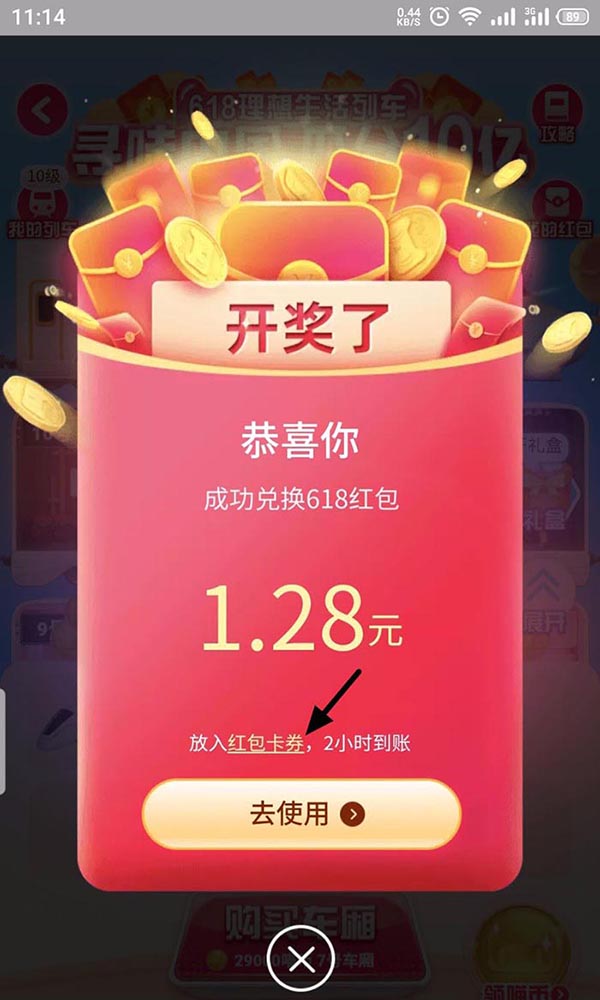 4、开奖成功,就会显示获得的红包金额,可以点击去使用,或者点击 红包卡券;