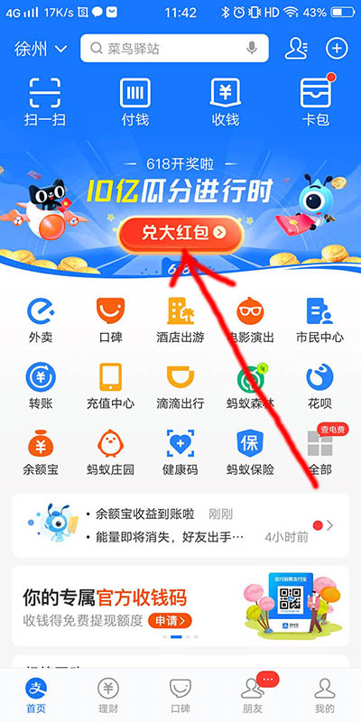 或者进入支付宝首页,请点击如下图所示的位置,也可以进入开奖页面。