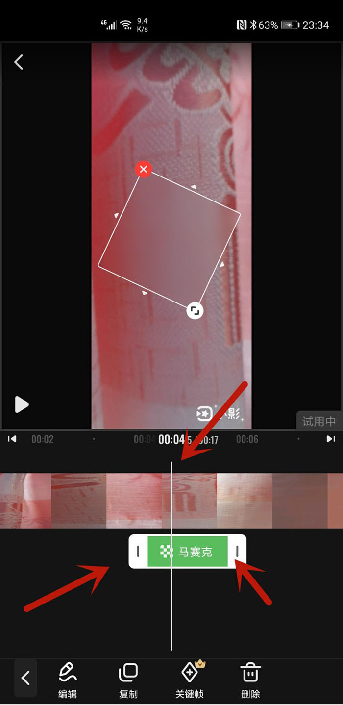 6、然后视频出现虚化效果马赛克的框,拖动选择虚化的位置和大小。