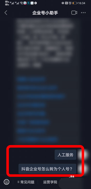 4、进入企业号小助手的聊天框,发送人工服务,再发送抖音企业号转个人号。