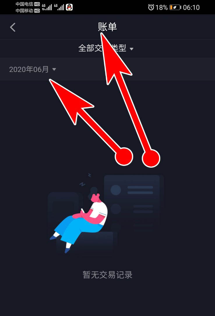 7、点开账单,这里我们就看到她可以筛选年份月份还可以筛选交易的类型之类的,因为我没有花过钱,所以这个账单是空的。