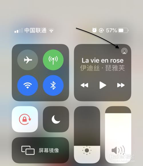 连接好二个 AirPods 耳机以后,请同时戴上两副耳机。接下来请从屏幕右上角往下滑动,调出控制中心,然后请点击「音频」图标,如图所示。