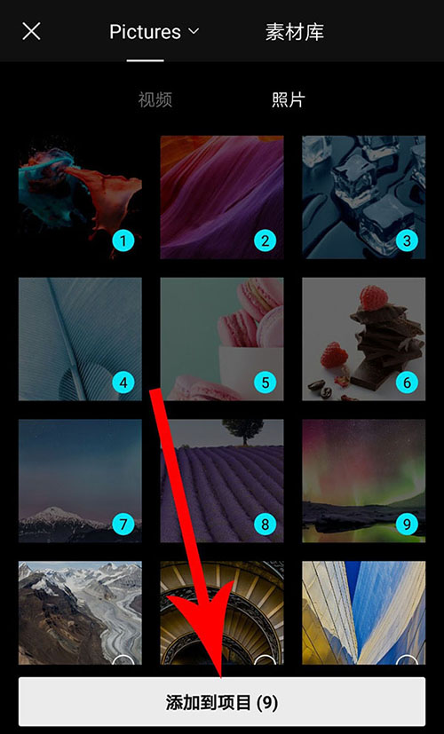 2、打开手机相册后勾选照片,然后点击“添加到项目”