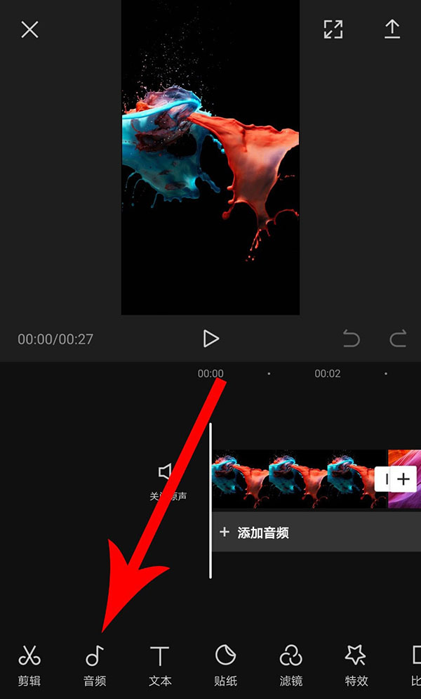 3、打开视频剪辑界面,点击“音频”