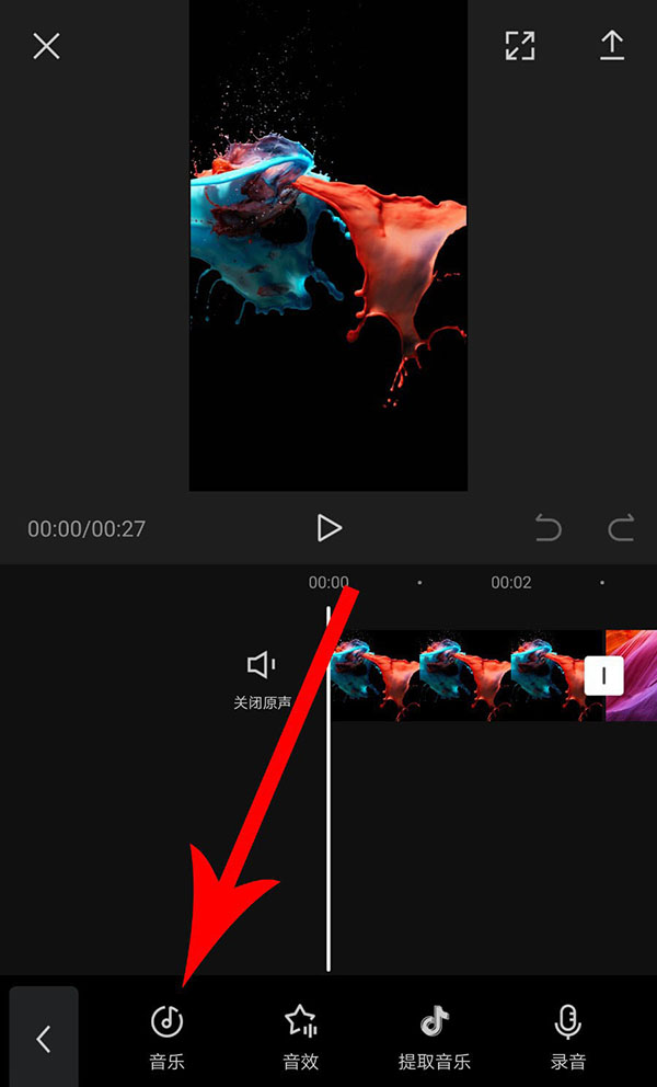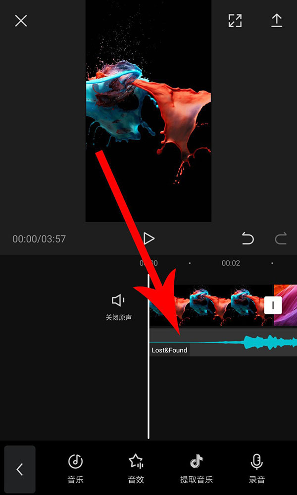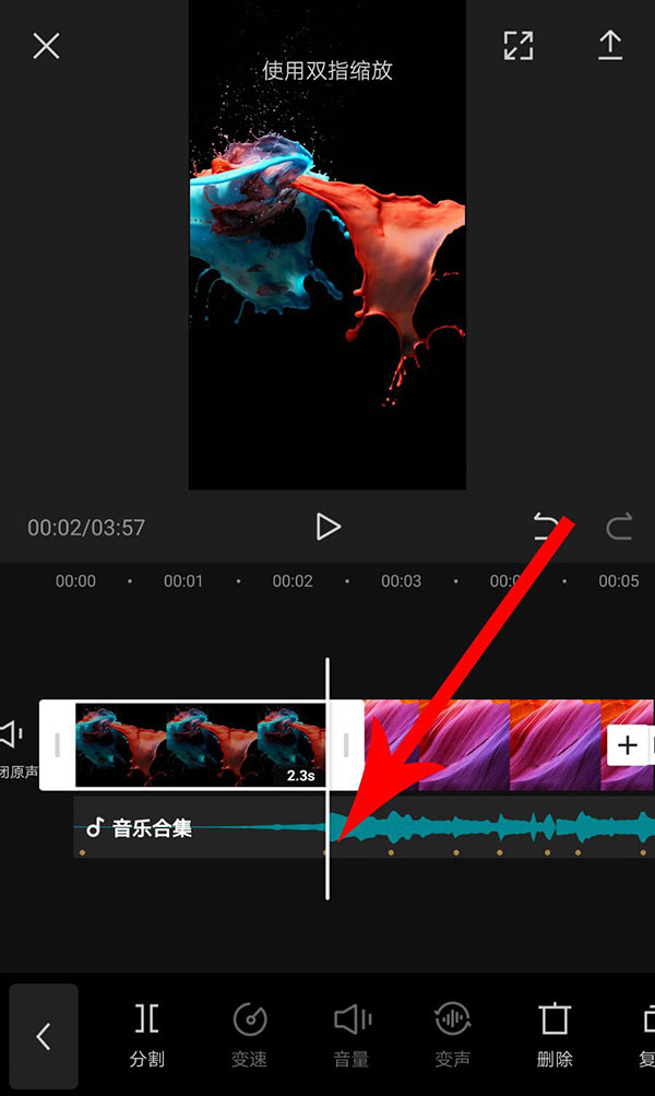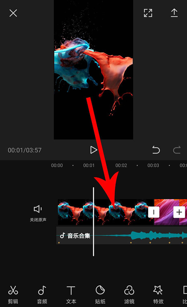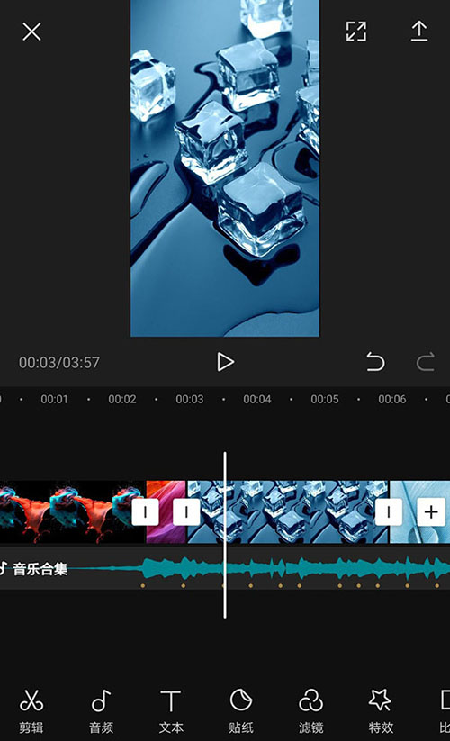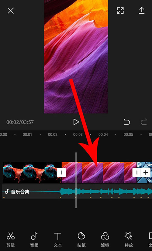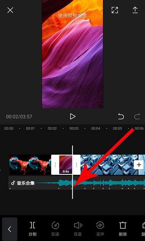 8、完成卡点音乐添加以后返回到视频剪辑界面,然后点选音频素材