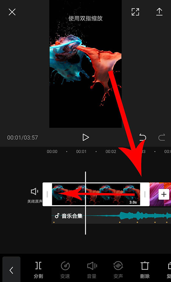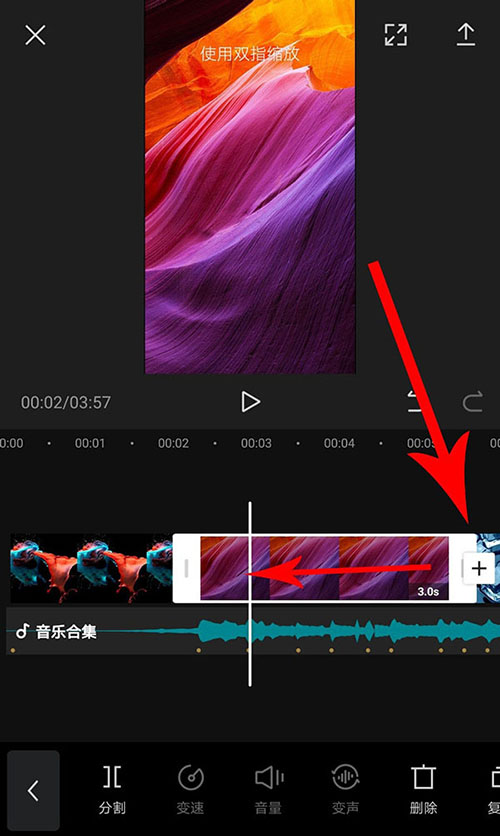 两个圆点之间是一个节奏卡点,通过选中图片和拖动图片时长选框的方式,将图片放到两个圆点之间,这样便可制作出图片卡点视频