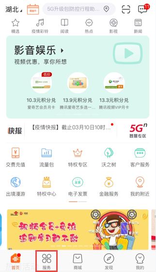 1、打开联通的手机营业厅APP,点击底部菜单的服务;
