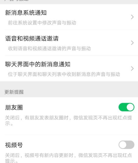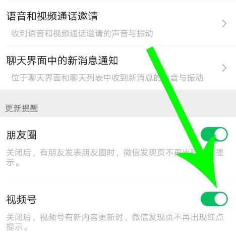 5、滑动至界面底部,然后点击“视频号”右侧的绿色“开关”按钮,按钮变成灰色后,微信视频号就不会出现红点提醒了。