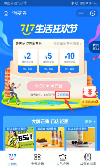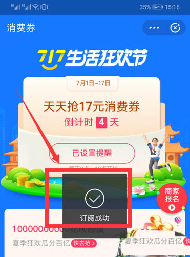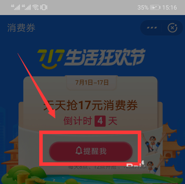 5、消费券领取界面,活动从7月1日—17日,点击“提醒我”。