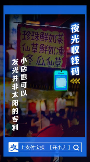 支付宝上线的新款收钱码,对于晚上开店或摆摊的朋友来说是很便利的,白天晚上均可使用,白天效果跟平常使用的是一样的,到了夜间就会发光,越黑光越亮;晚上扫码也更加醒目容易识别出来。