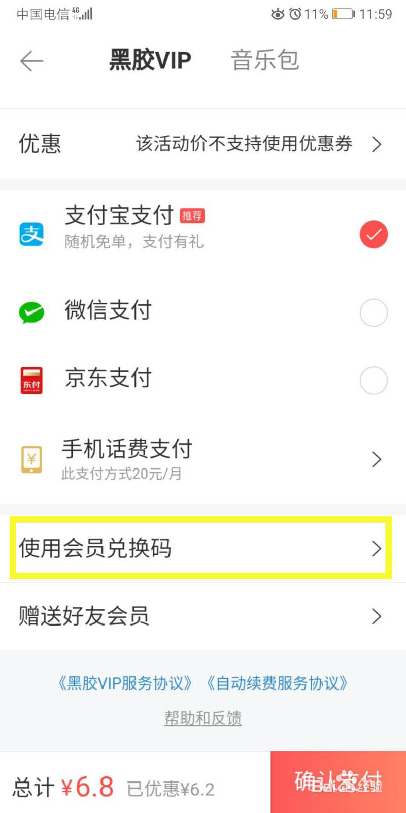 4、注意这里省去支付,选择使用会员兑换码