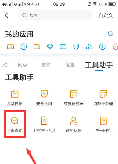 3、在工具界面中,我们需要在工具助手一栏中找到“利率查询”的选项,点击进入利率查询界面。