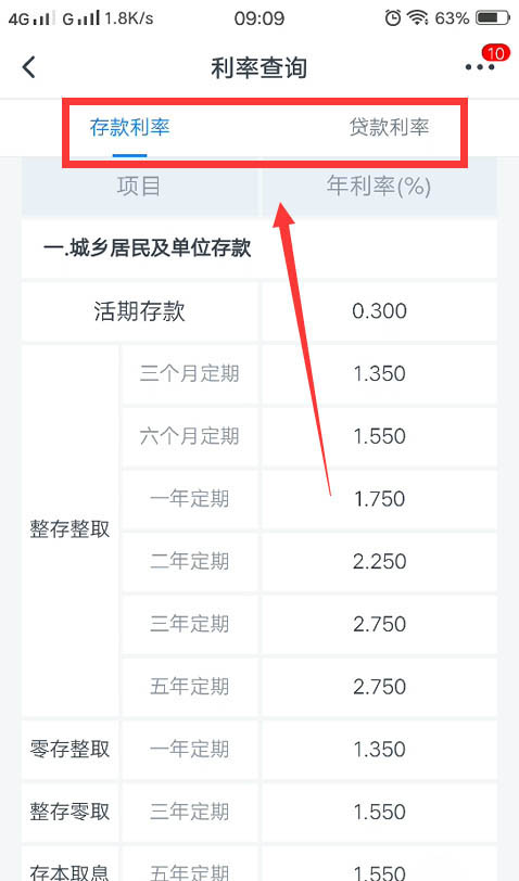 4、接着,我们可以在出现的界面上方选择“存款利率”或者“贷款利率”。