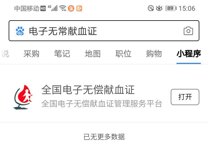 打开微信搜索“全国电子无偿献血证”,进入小程序。