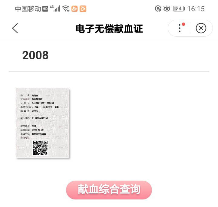 点击【电子无偿献血证】,进入电子无偿献血证页面,查看电子版的无偿献血证。