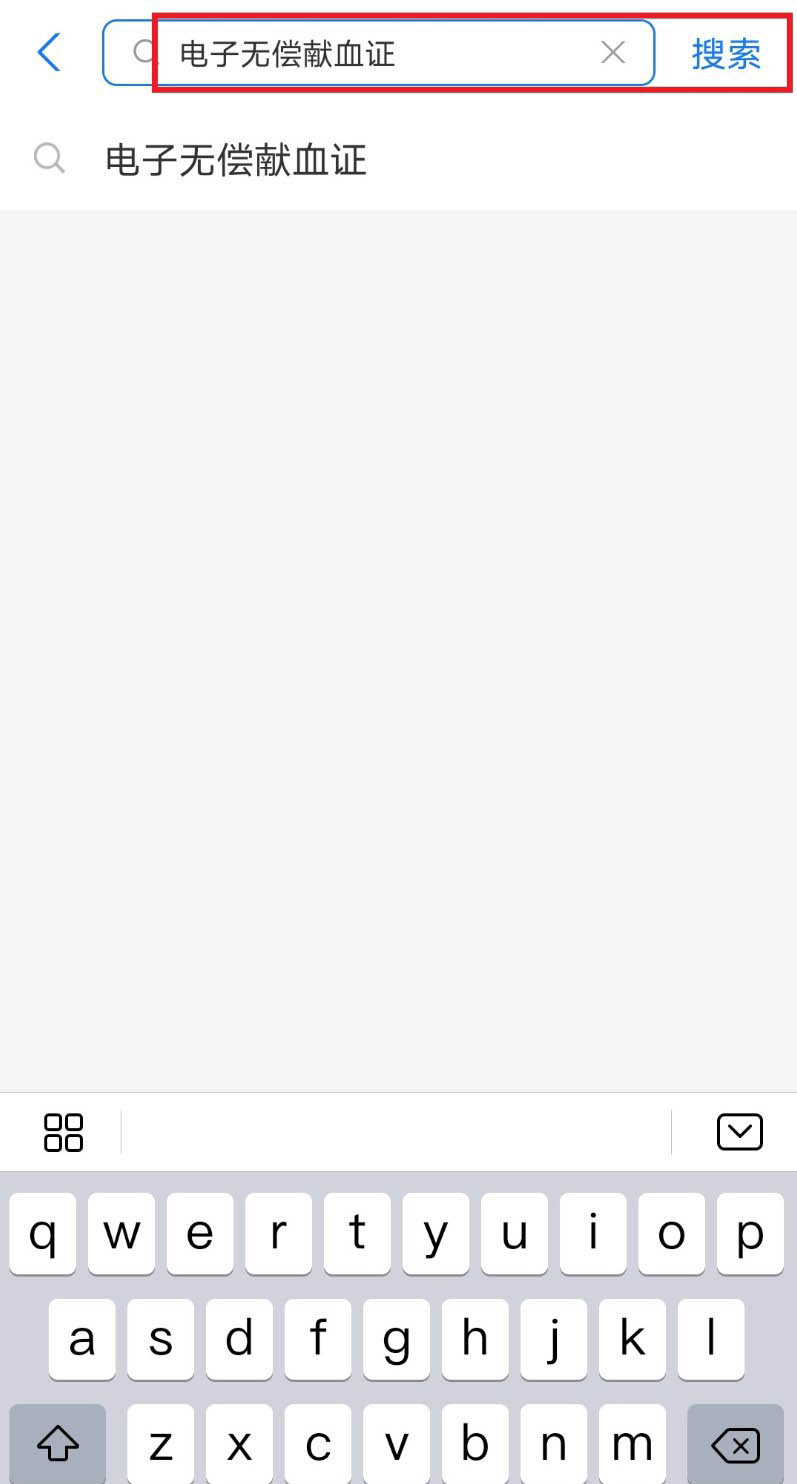 1、打开支付宝,在搜索栏输入“电子无偿献血证”,点击搜索。