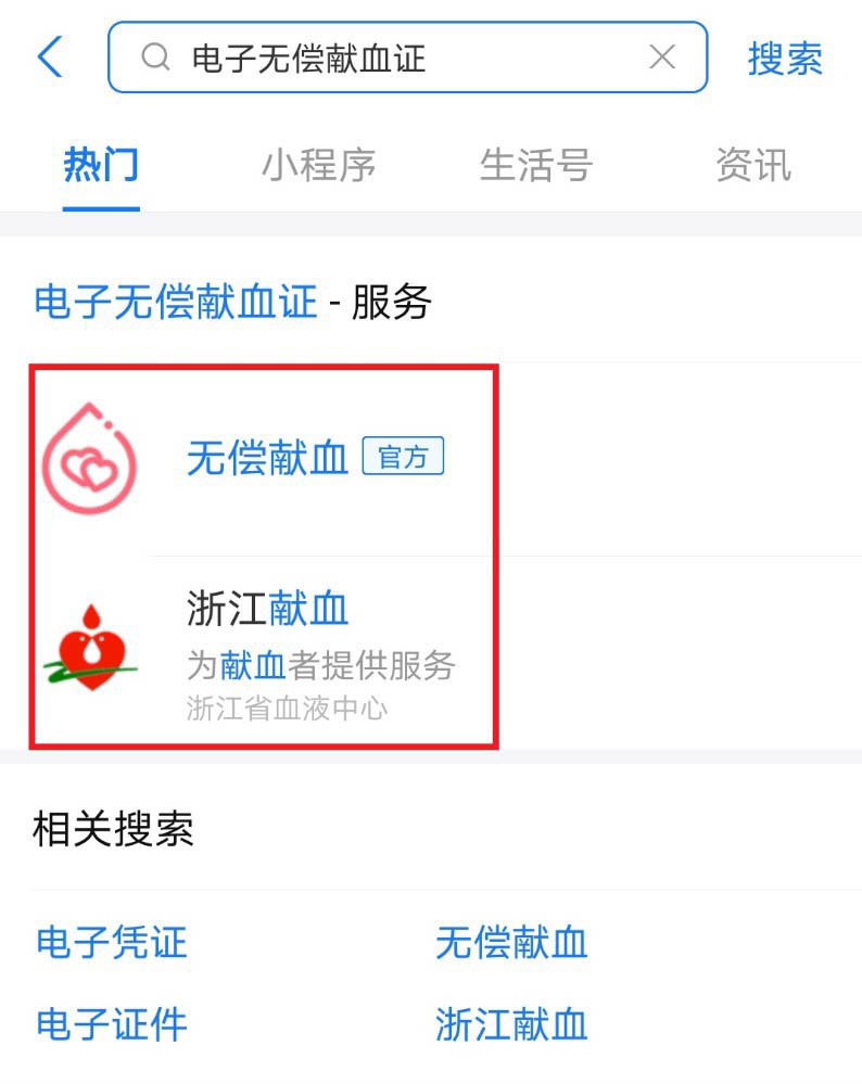 2、点击弹出的“无偿献血(官方)”或者“浙江献血”。此处的“浙江献血”并非浙江居民才可申领的意思。此次全国电子无偿献血证管理服务平台设在浙江省血液中心。