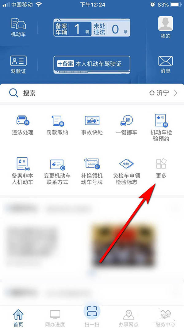 1、首先进入交管12123 ,找到下图中箭头所指的更多菜单,点击进入。