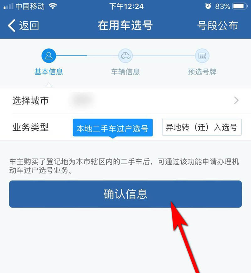 3、进入在用车选号页面,输入选择城市和业务类型,点击下方的确认信息。