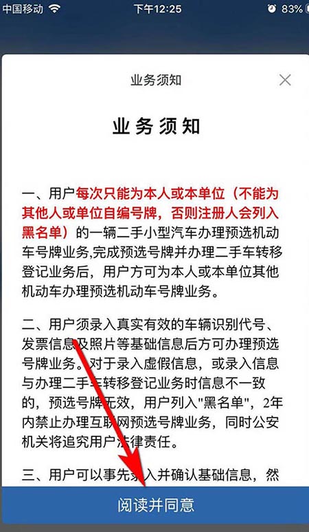 4、查看办理要选号的相拥信息,点击底部的阅读并同意。