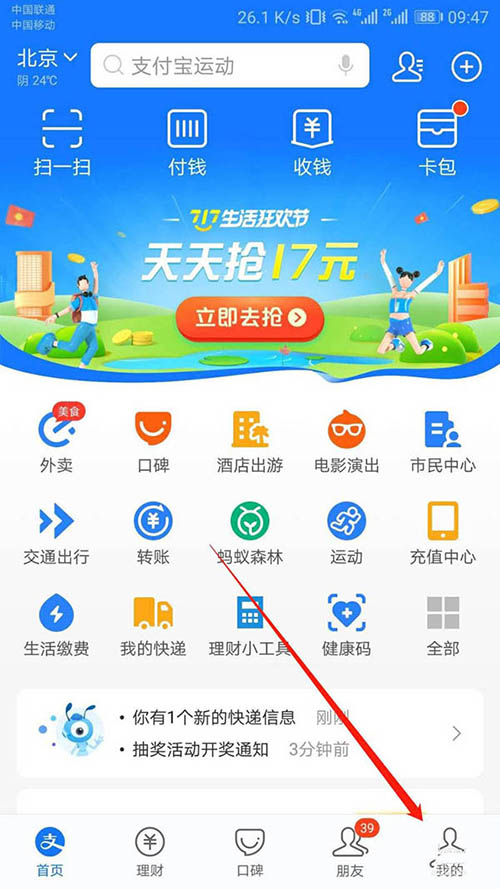 2、在“支付宝”主页,右下角点击“我的”。