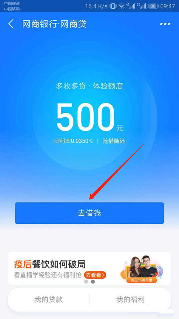 4、“网商贷”页面可以看到属于自己的额度,点击“去借钱”。