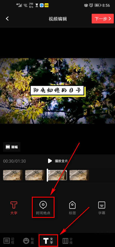 5、底部点开文字,点击时间地点。