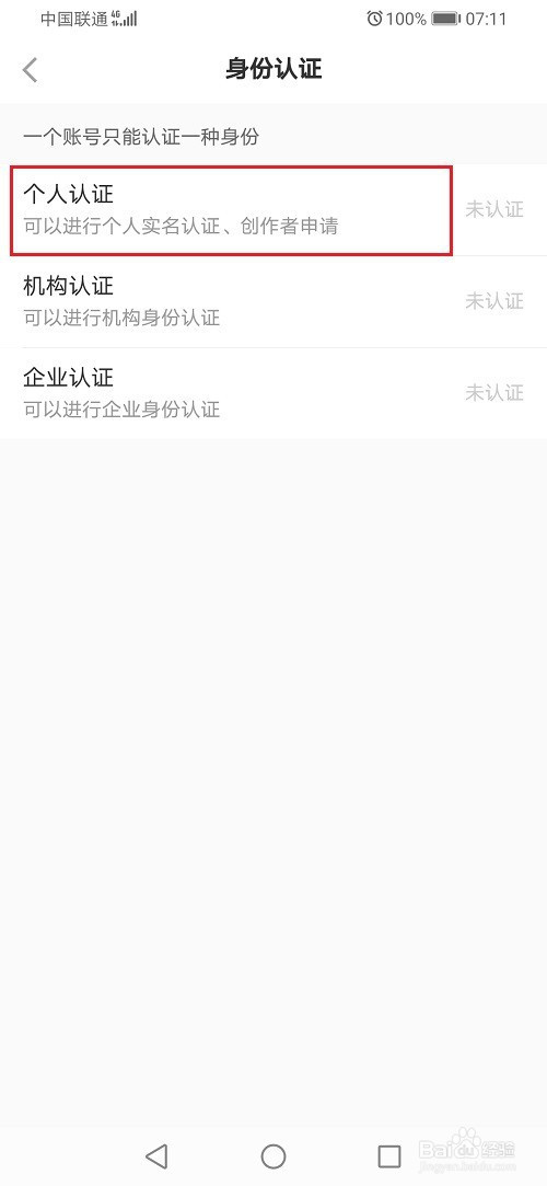 第三步进去之后,点击个人认证,如下图所示: