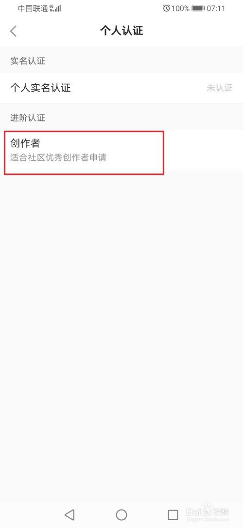 第四步在个人认证界面,点击创作者,如下图所示: