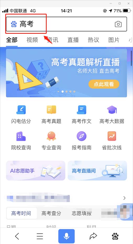 1、进入百度APP,打开百度搜索引擎,搜索百度AI志愿助手。