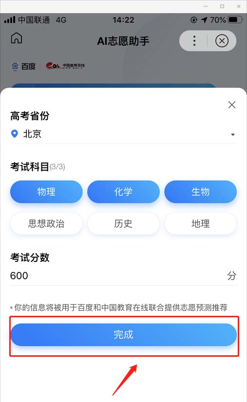 4、选择高考所在地、考试的科目以及预估的高考分数,点击“完成”按钮。