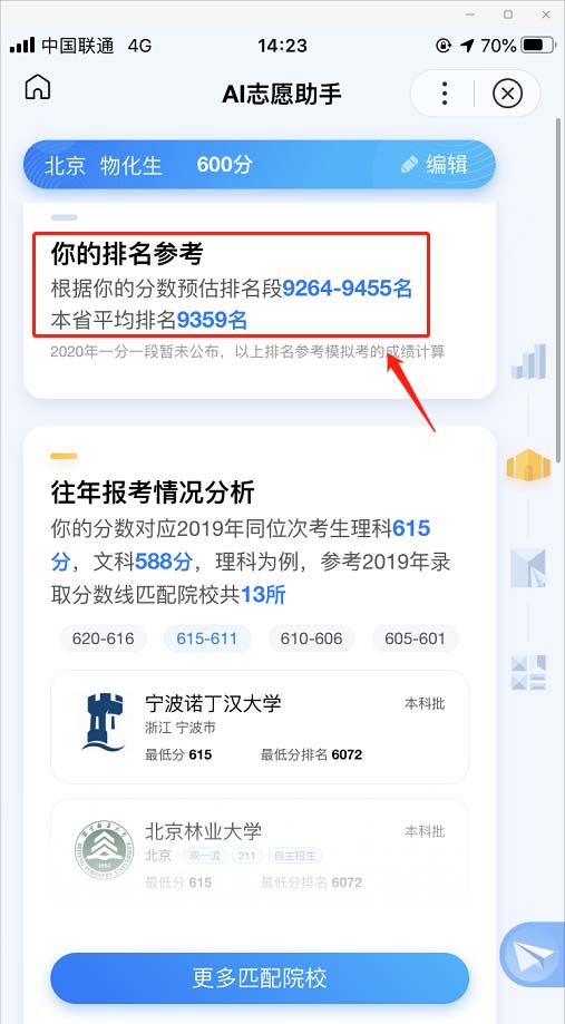 5、点击完成按钮后,会返回AI支援助手主界面,即可查询排名参考,预测高考名次。最后小编希望大家都能够取得好成绩。