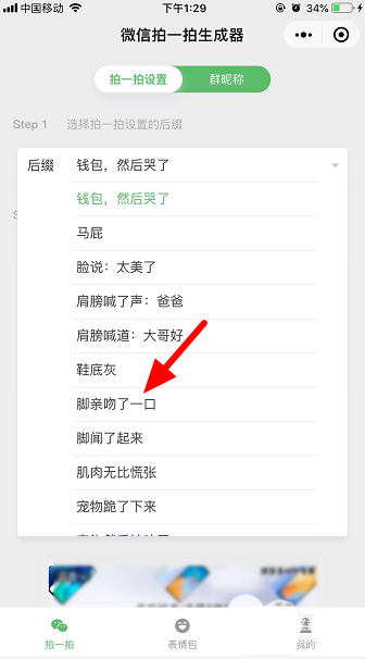 5、这里有很多搞笑后缀可以选择,比如:“马屁”“肩膀喊道:大哥好”“脚亲吻了一口”“脚闻了起来”等等,选择自己喜欢的。