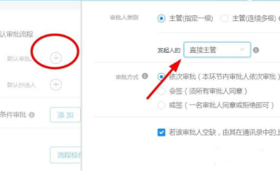 点击在审核人上的“+”来添加审核人员,审核类别选择“主管(指定一级)”选择直接主管,这个直接主管由组织结构中设置。