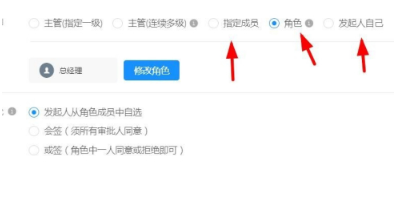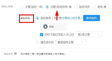 选择第二个“主管连续多级",只需要设置一个审核终点角色,就会按顺序自动一级级的审核过来,流程功能和第一种一样。