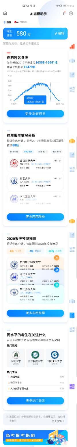 AI志愿助手app在百度app中搜索高考或者是AI志愿助手就能够出来这款软件,进入AI志愿助手可以进行预测分数线、预测名次线、院校查询和推荐高校等功能。那么2020高考AI志愿(大数据)助手报考分析怎么用?随着2020高考分数的出炉,家长与准大学生门都忙着志愿填报工作。选择合适热门的学校与专业。现在大数据很火,那么怎么使用大数据参考选择自己的高考志愿呢?下面给大家详细介绍一下具体步骤及说明。希望能帮助到有同样需求的朋友。