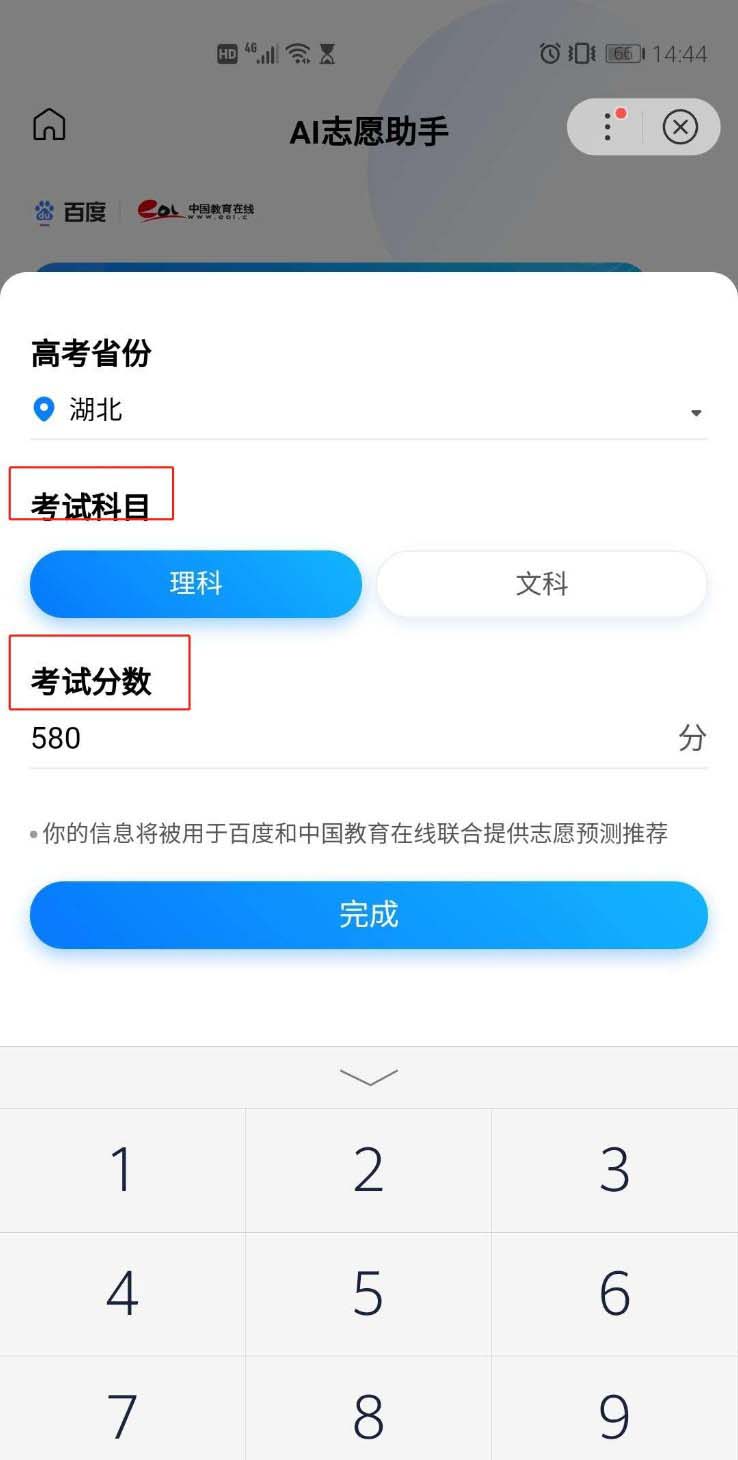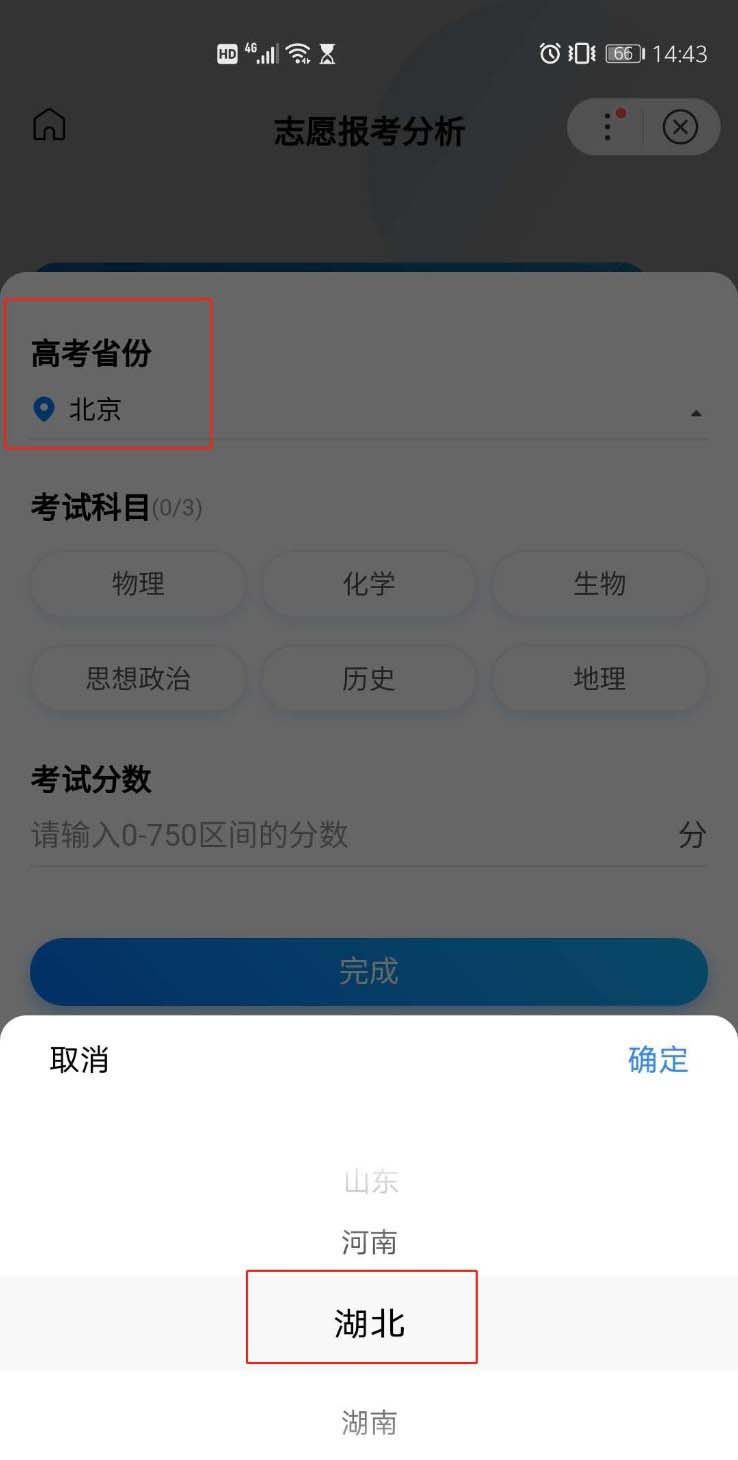 4、选择高考省份,科目与高考分数。之后点击完成。